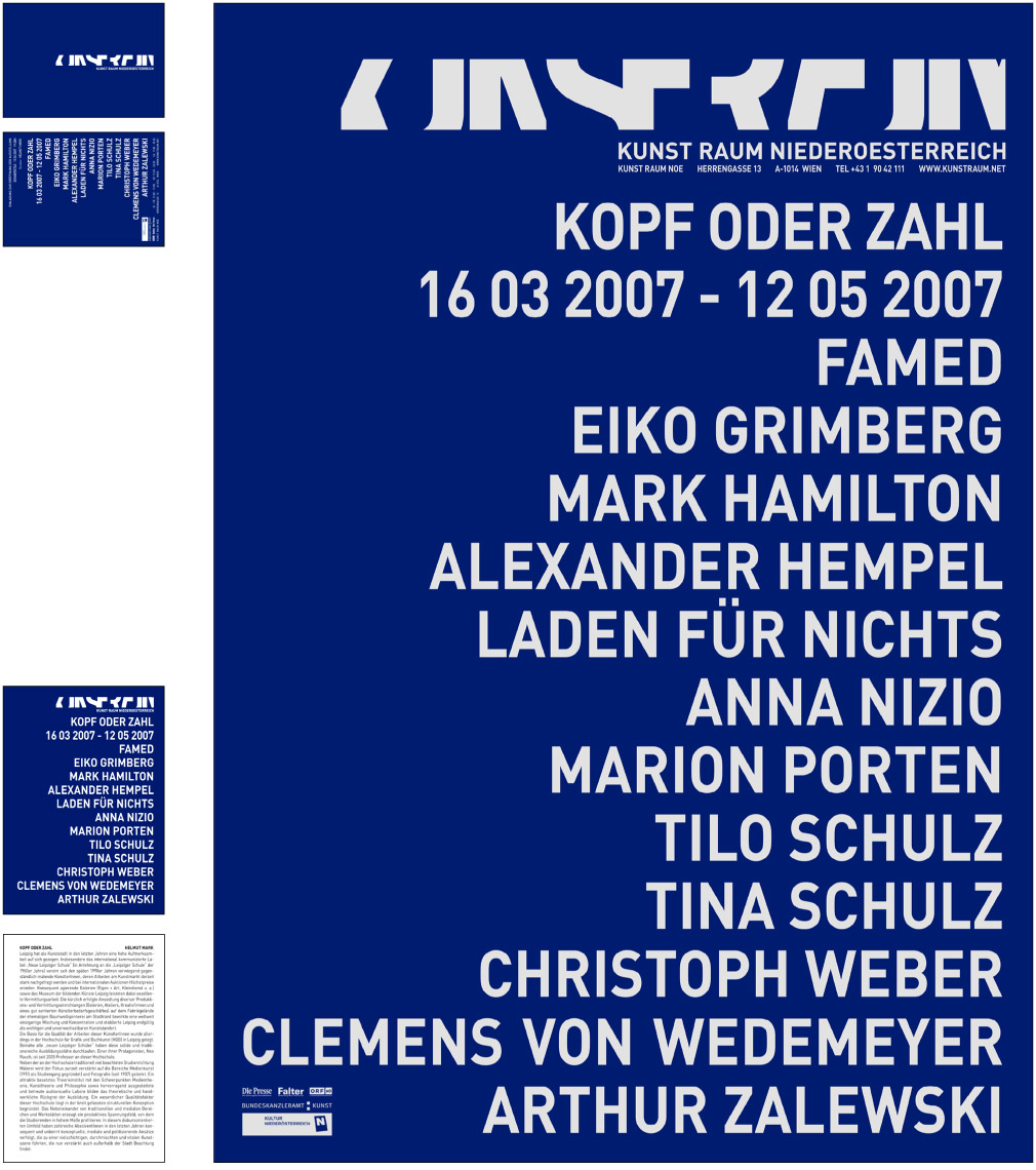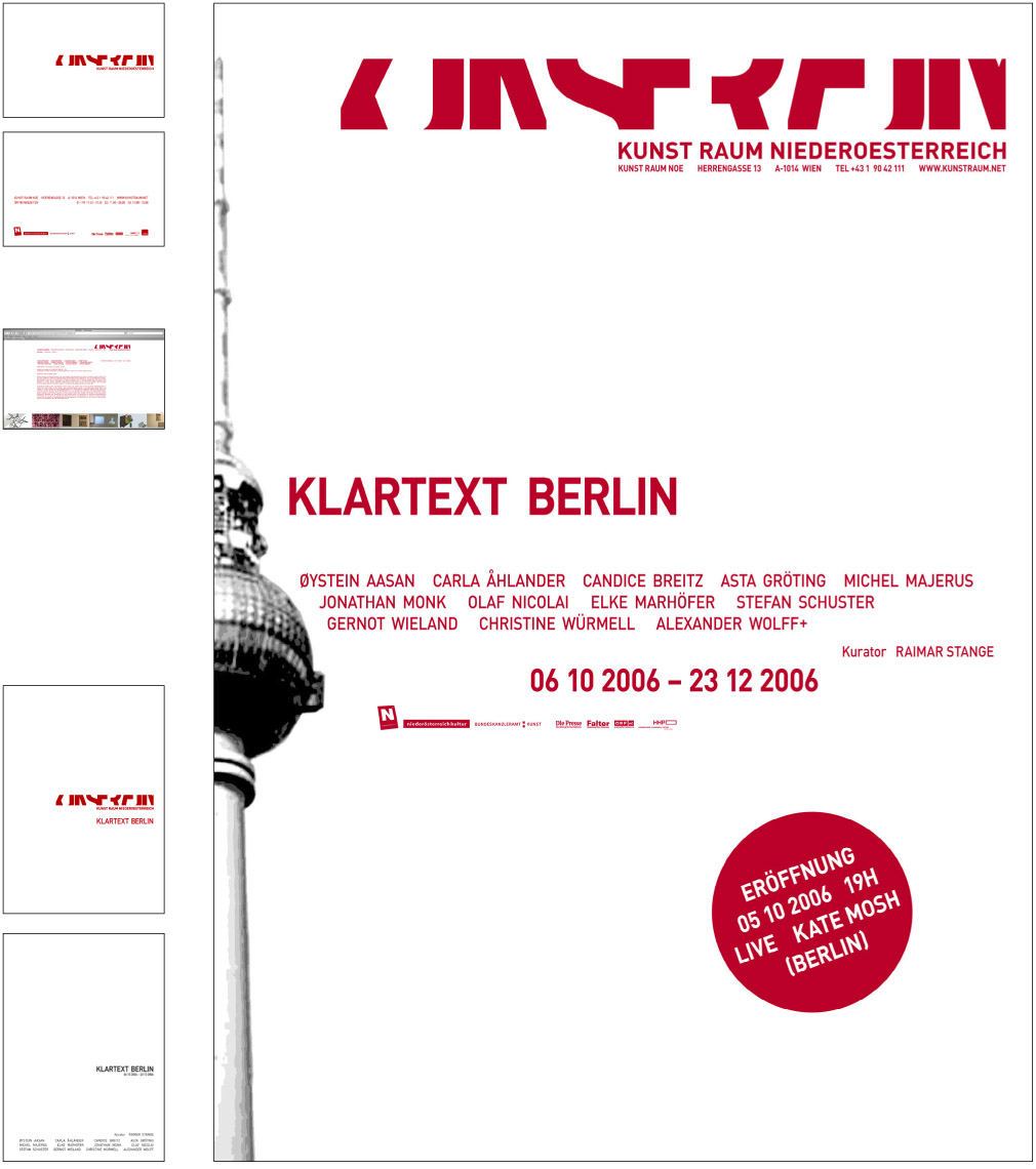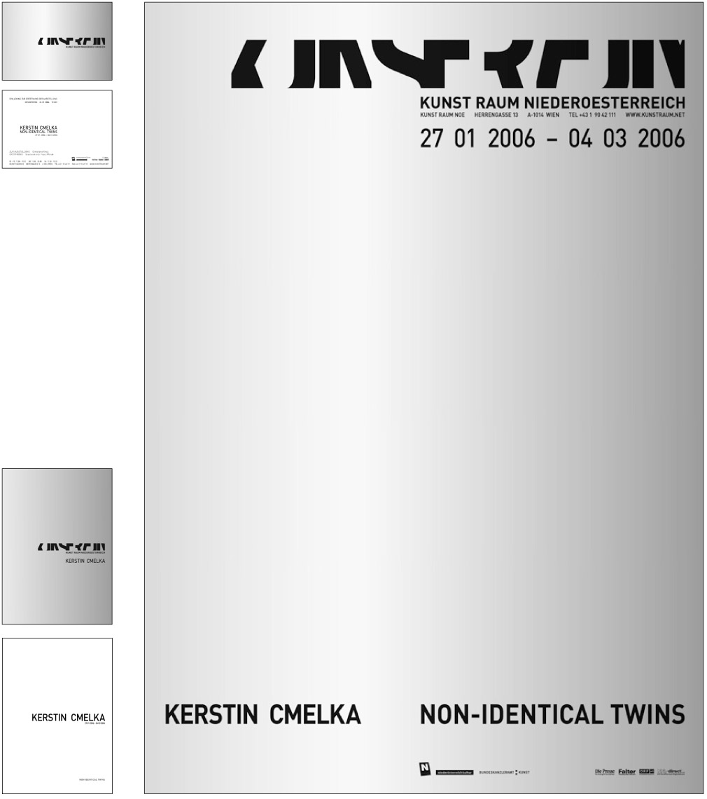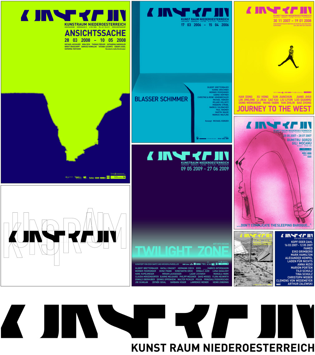 From 2005 till 2009 and ongoing - we designed after developing the corporate identity for the gallery ‘Kunstraum Noe’ [Art space Lower Austri]a –19 exhibitions packages. An exhibition package contains the design of a poster, an invitation card, a catalogue (1 to 20 artist), advertisements and the website. [the site has been relaunched]