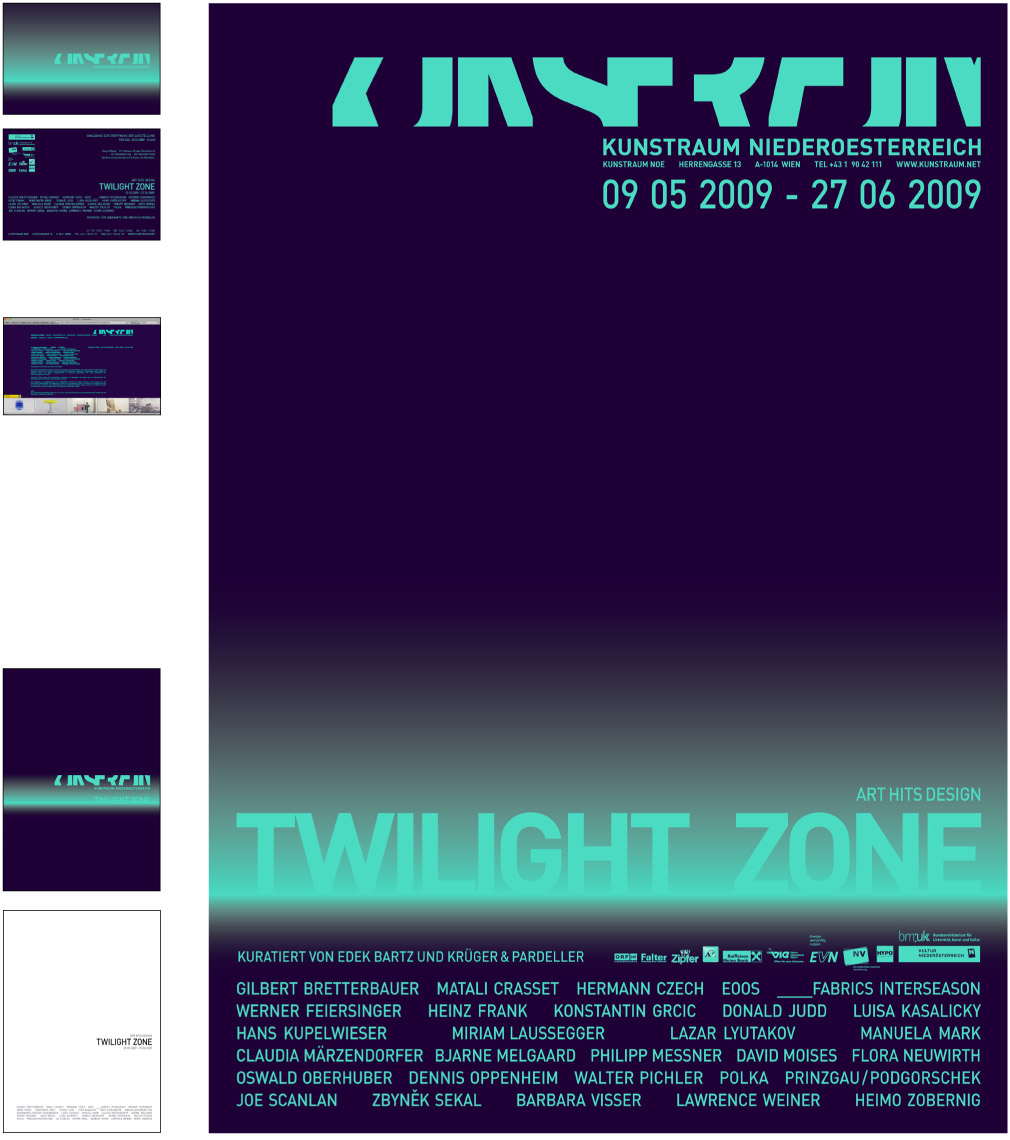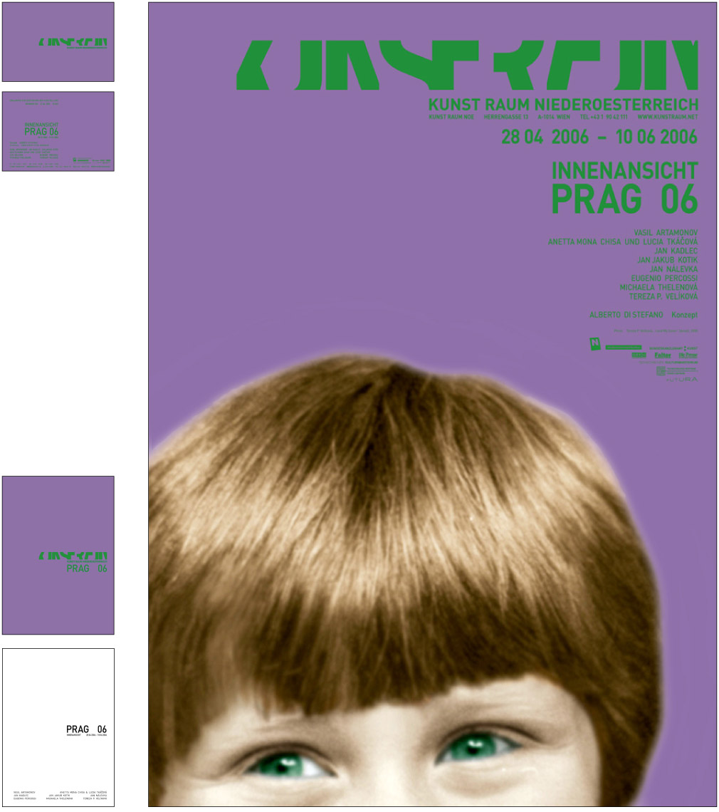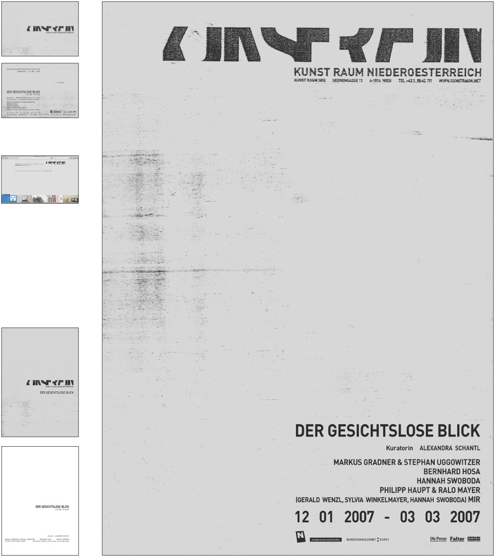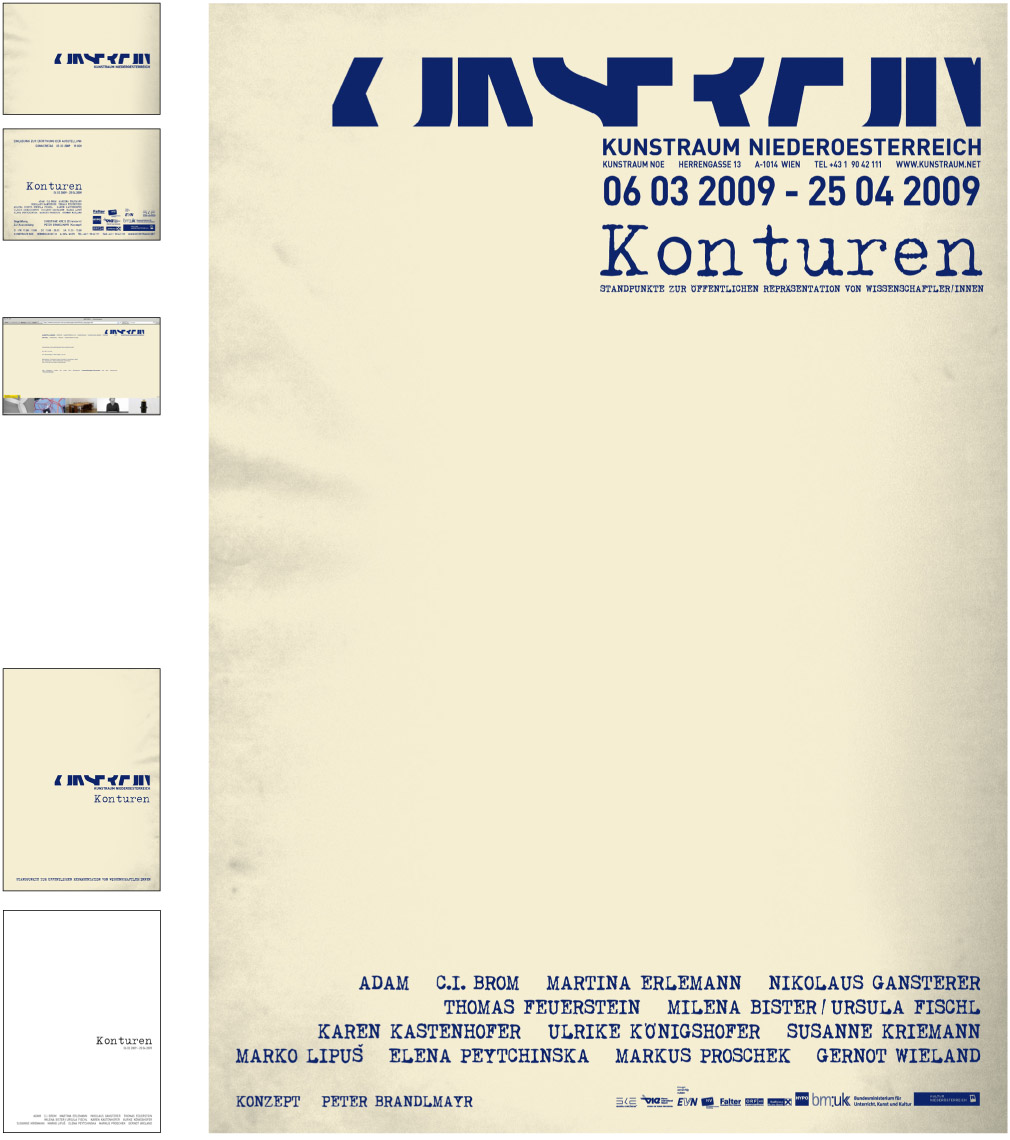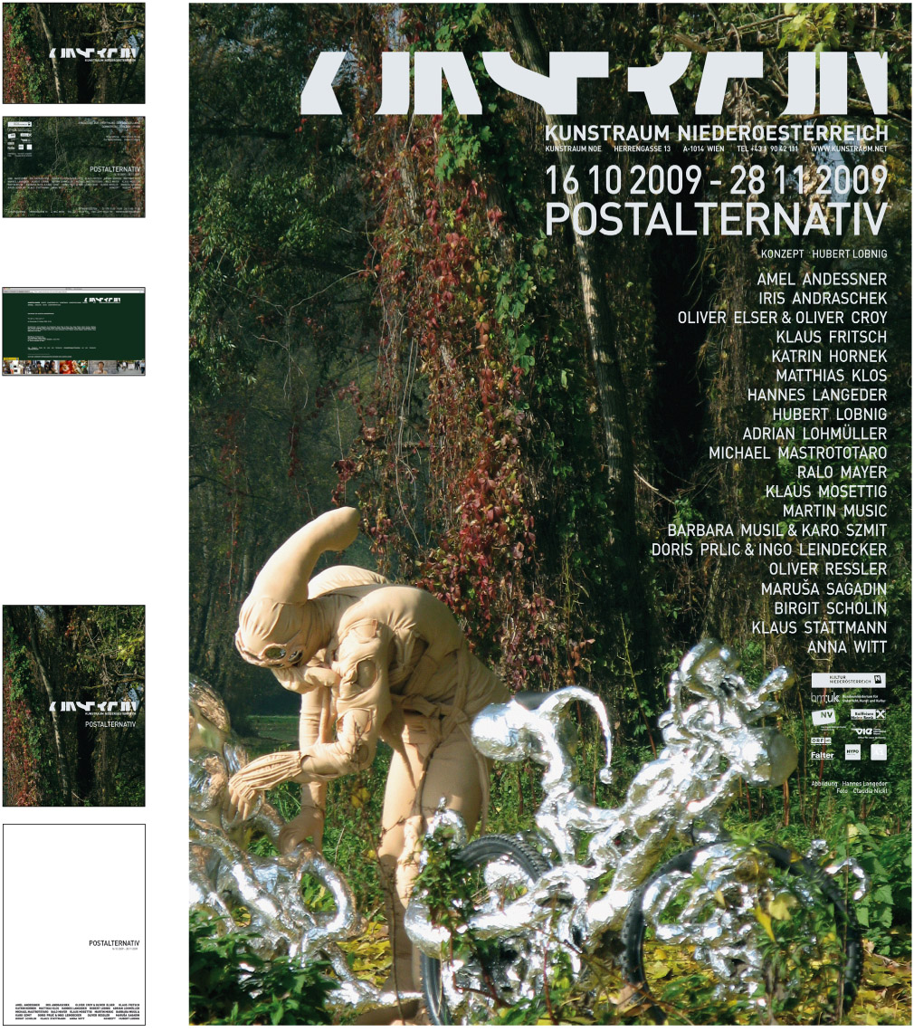 From 2005 till 2009 and ongoing - we designed after developing the corporate identity for the gallery ‘Kunstraum Noe’ [Art space Lower Austri]a –19 exhibitions packages. An exhibition package contains the design of a poster, an invitation card, a catalogue (1 to 20 artist), advertisements and the website. [the site has been relaunched]